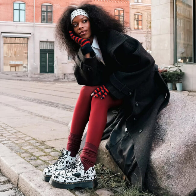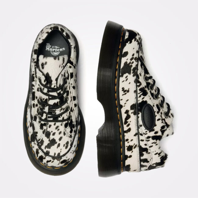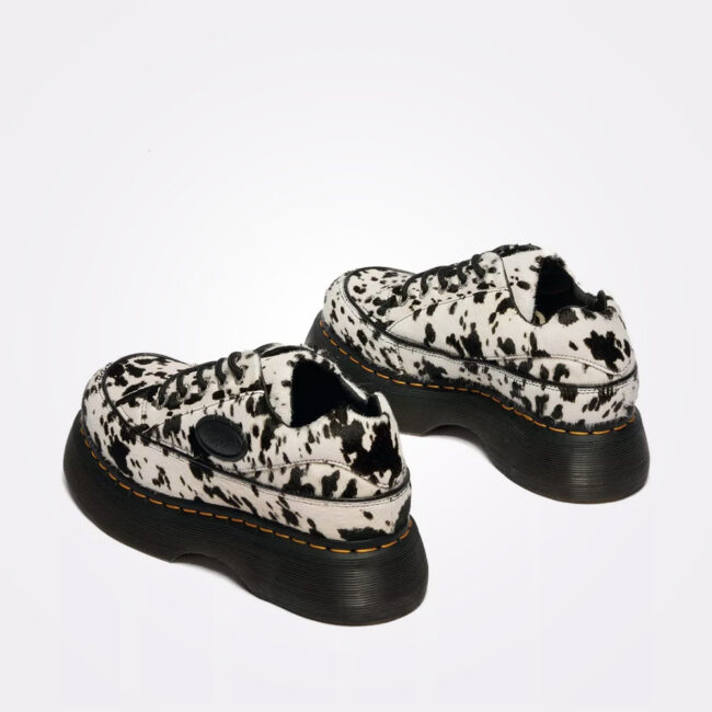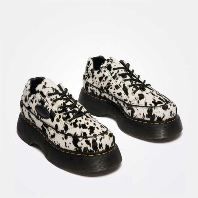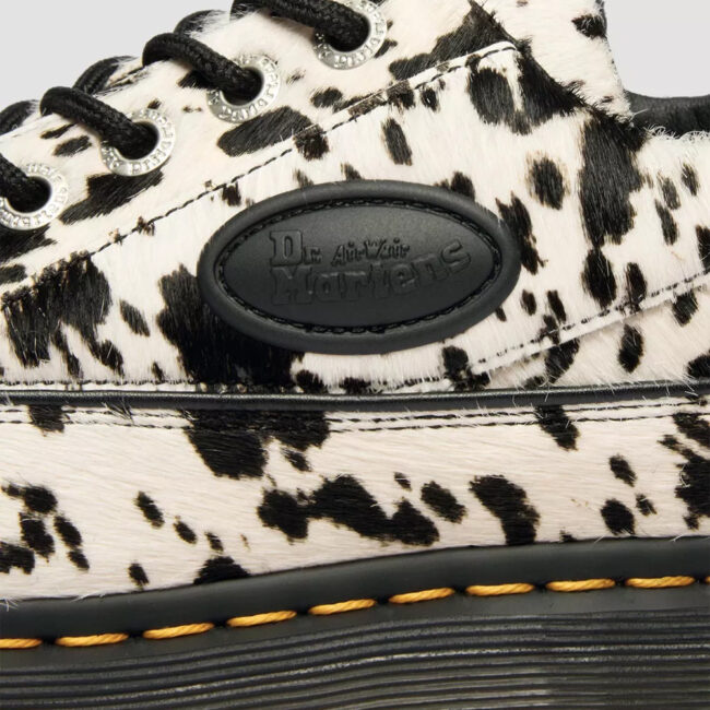 Dr. Martens Buzz 5i unosi 90s energiju sa upečatljivim dalmatinskim printom. Gornjište je izrađeno od Dalmatian Hair-On kože sa crnim pertlama. Pamučna peta, kontrastni šavovi i gumeni logo dodaju karakter, dok čvrsti, debeli Buzz đon sa žlebovima, žutom šavom i uzorkom lista na đonu osigurava prepoznatljiv Dr. Martens stil.