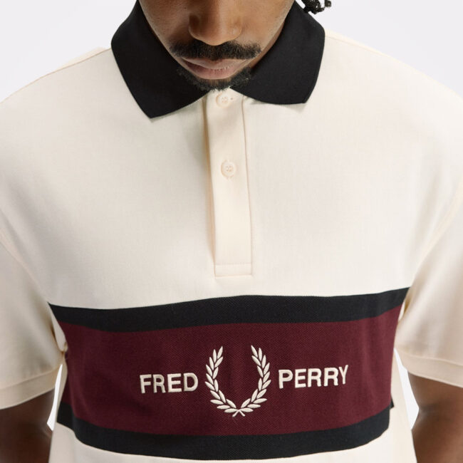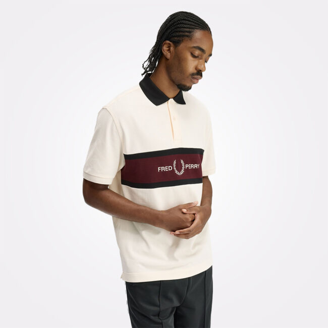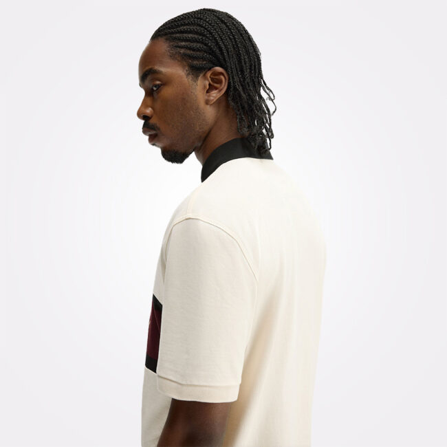 Polo majica opuštenijeg kroja izrađena od prepoznatljivog Fred Perry pamučnog piqué materijala, sa kontrastnim cut-and-sew panelom preko grudi. Klasična sportska osnova reinterpretirana je kroz savremeniji, doteran izraz koji zadržava jasnu vezu sa DNK-om brenda. Model donosi suptilan balans između tradicije i modernog senzibiliteta, uz ravno pletene završetke koji dodatno definišu siluetu.
