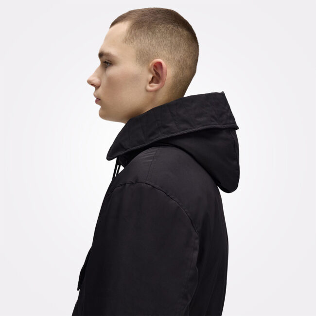 Super topli gornji sloj sa detaljima inspirisanim praktičnošću, napravljen za hladnije mesece. Reciklirana poliesterska keper tkanina / Opušten kroj / Imitacija dugmadi od korozoa / Našivni džepovi na grudima i kukovima / Izvezeni logo lovorovog venca na levoj strani grudi