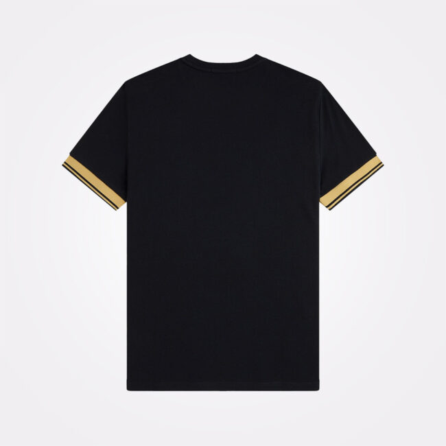 Majica sa okruglim izrezom izrađena od lagane verzije klasičnog pamučnog piqué materijala. Prepoznatljivi Fred Perry kodovi reinterpretirani su kroz twin tipping detalj na ravno pletenim manžetnama, čime se postiže čist i suptilan izgled. Kombinacija crne i Champagne nijanse prisutna je još od 1950-ih i potvrđuje da ovaj bezvremenski spoj i danas ostaje savremen.