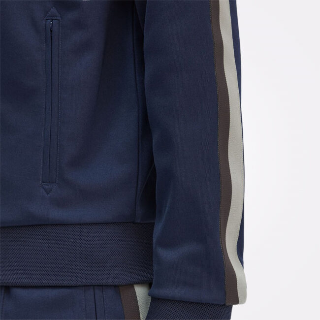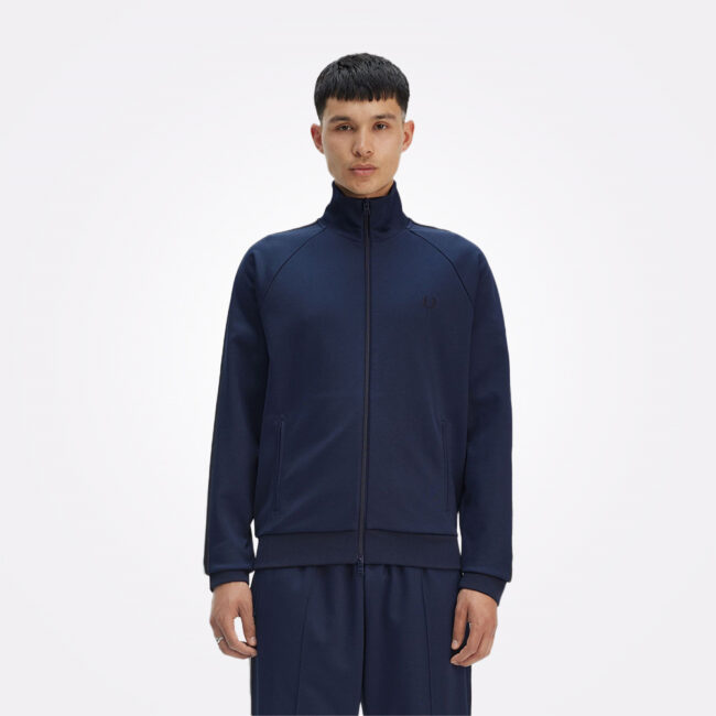 Prepoznatljiva Fred Perry trenerka jakna, izrađena od kombinacije pamuka i recikliranog poliestera. Dizajn uključuje piqué teksturirane ravno pletene rubove na porubu i manžetnama, kao i dvobojnu pletenu traku duž rukava, koja unosi sportski sofisticiran izgled.